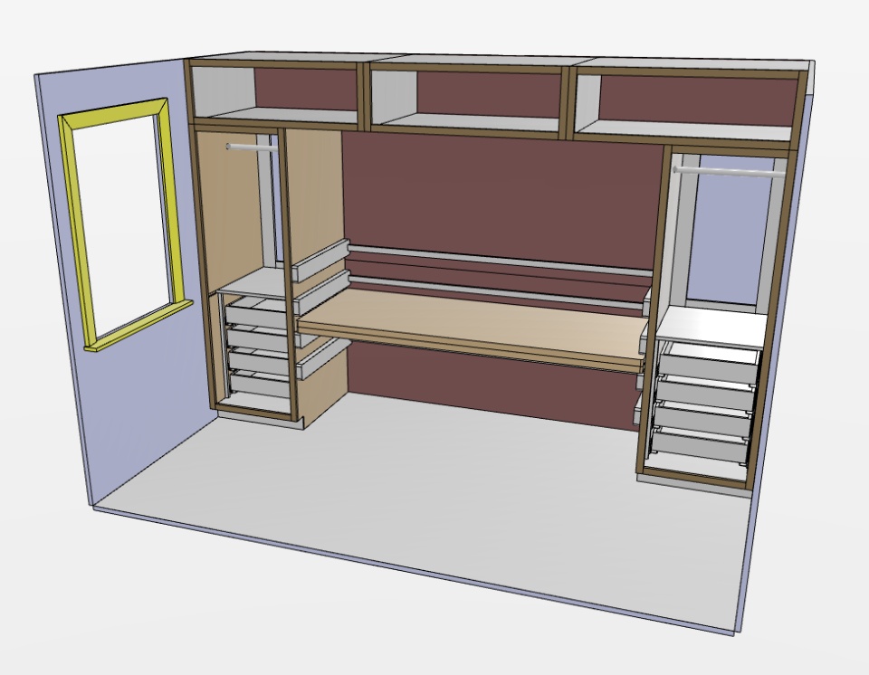 In my second design I made 3 larger shelves span the length of the back wall. The 2 end cabinets are shorter but proper hanger height. I stuffed 4 drawers into the bottom of each cabinet. Currently, I have 4 different heights for the table.