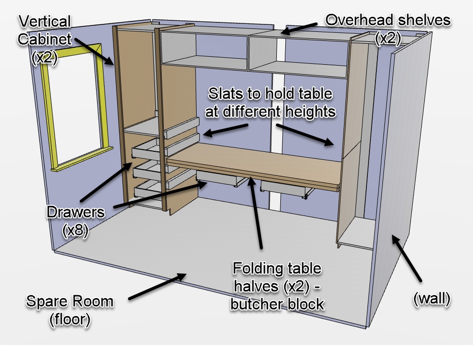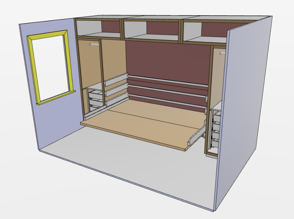 In the first design shown above, I made each end cabinet the full height of the room. But then I decided to make the shelves go across the full length of the wall instead, as I thought it was a better use of the space. In the first design I considered affixing 2 of the drawers to the underside of the table. I did not like the look of this and it would make the table heavier to lift to the various heights.