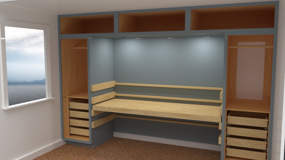 I rendered this to get a look at the possible materials, colors and lighting. I will build the cabinets out of 3/4" plywood and face the natural woodgrain to the inside of the cabinets. The outside would be painted a steel grey of some kind, final color tbd. The table tops will be butcher block and will use solid wood for the table stops and card rails. It was fun to render this project in visualize and I can usually find all the materials I need. I also used one of the default back plates which creates a much nicer view out of my window!