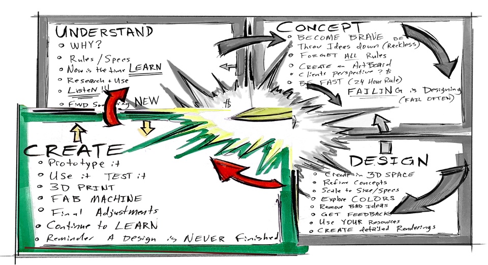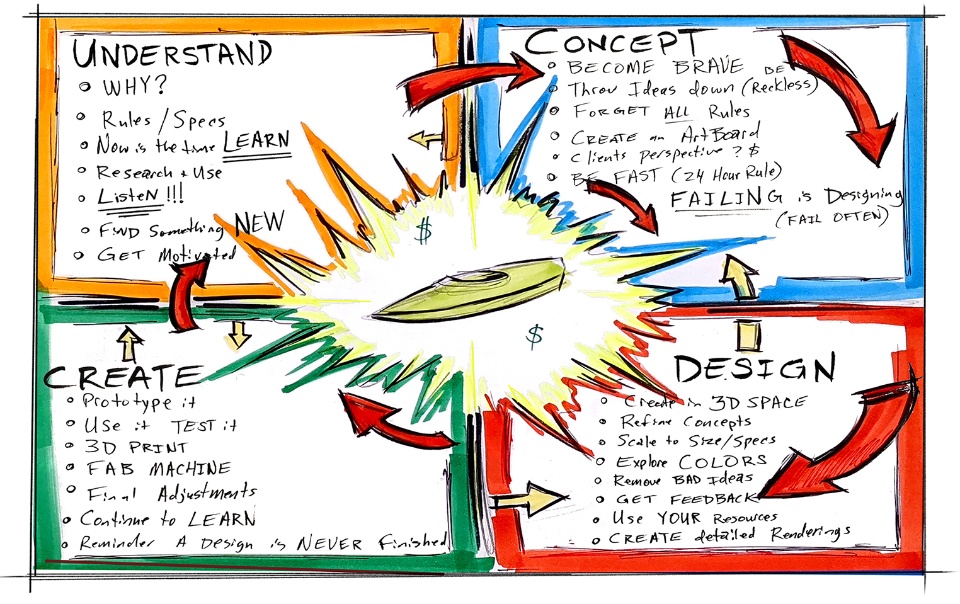 This Creative Design Process has been key to countless design challenges during my industrial design career. I've picked up these phases and tips from various sources – past projects, friends, colleagues, and clients. It's crucial to slow down and reflect on these phases, understanding that they work in a circular fashion, each phase influencing the other.