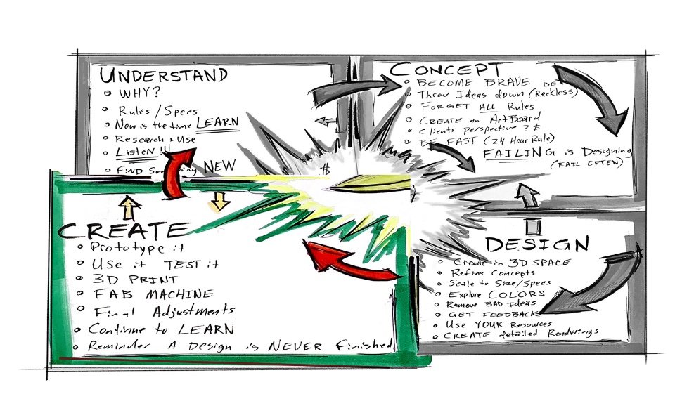 This Creative Design Process has been key to countless design challenges during my industrial design career. I've picked up these phases and tips from various sources – past projects, friends, colleagues, and clients. It's crucial to slow down and reflect on these phases, understanding that they work in a circular fashion, each phase influencing the other.