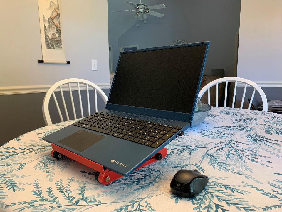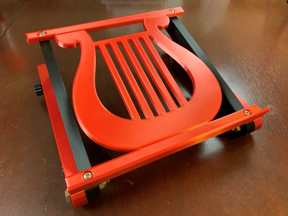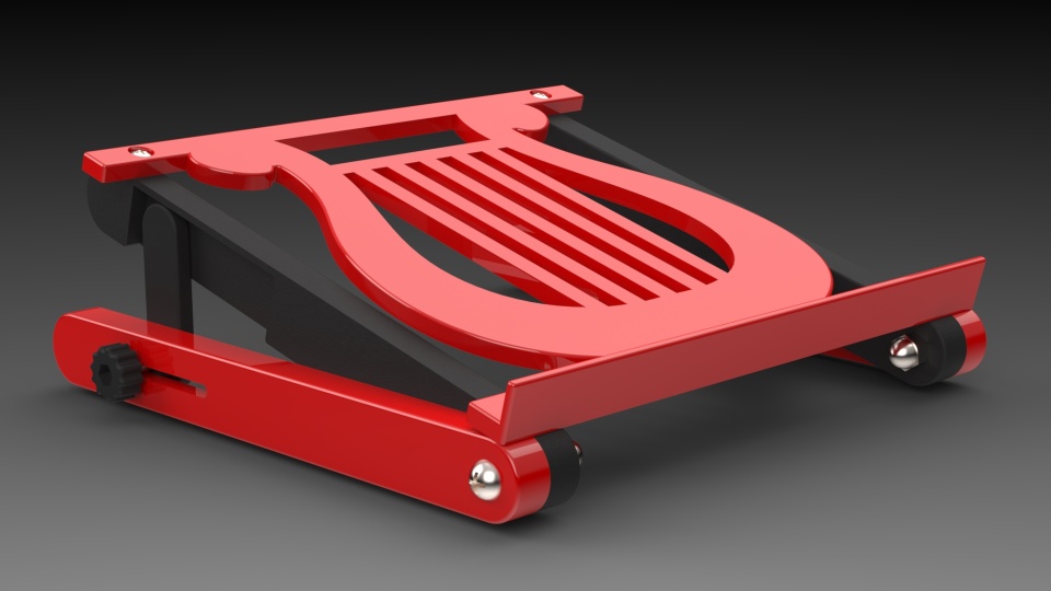 My wife does a lot of online research at a stand up desk, and asked if I could make her an adjustable laptop stand. So, I popped into SOLIDWORKS and started the design process. We are both musicians, so I wanted to incorporate that into the design somehow. I used an image of a lyre as a sketch picture to trace the design for the platform. I designed all the parts to be made on my 3D printer without any support material. Zero waste! I like to use hardware in my designs, and especially like using brass inserts and making my own knobs. I used little rubber feet to provide traction and stability. You'll notice one of the images is produced with Visualize because, why not! She loves the laptop stand as she can position it exactly where she wants it! This was a great little project, check out the images of this fun build.