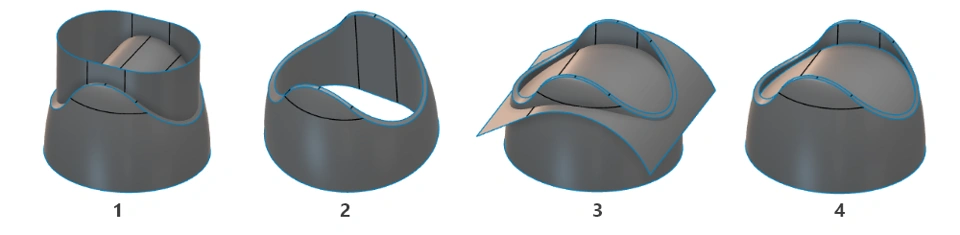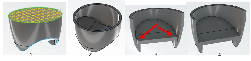 - Then trimmed the outside of the interior top surface using the vertical extruded surface from step 1 above.