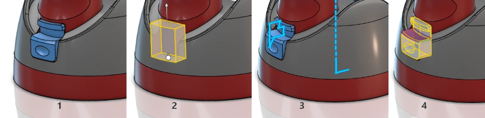 - The last image above shows the complete cap component that is shelled, has 2 small pins for the hinge and a tab on the front edge to interact with the button to keep the cap in the closed position. I will not go through all of the features but you can investigate from the included model. Since the hinge is defined, you can create the cuts in the Cover part for the hinge too. To do this, activate the Design Feature Set which contains the geometry for the cover. Start a sketch on the ZX Plane and select one of the edges at the end of one of the pins on the side of the Cap and Convert Entities. Create an Extrude Cut from the midplane and have it intersect with the 2 ears on the cover. Since we are creating the cut in the Design Features Set, the Cap geometry is not cut but the cut references the size and location of the pins.