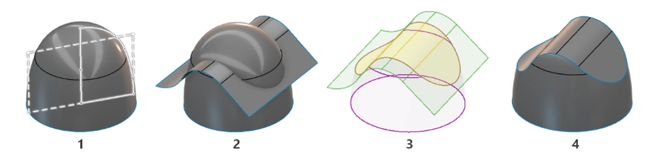 - Used the Trim Surface feature once again to remove the inside-top face of the curved top surface and the top faces of the extruded surface that extended above the dome.