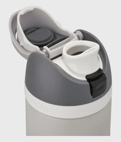 The product combines a vacuum-sealed metal container with a thoughtfully engineered lid. The lid features an overmolded rubber exterior, a dual-function spout that supports both pouring and sipping through a straw, and a spring-loaded hinged cap that seals securely to prevent leaks. Additionally, the integrated handle follows the curvature of the lid and shares the same hinge axis as the cap, allowing it to remain compact when folded down while still being comfortable to hold when raised.