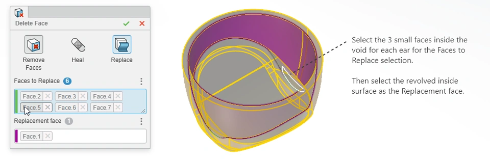 Image 3 shows a section view cutting through the middle of the ears so that you can see the small voids. I used the Delete Face command that has Replace option.