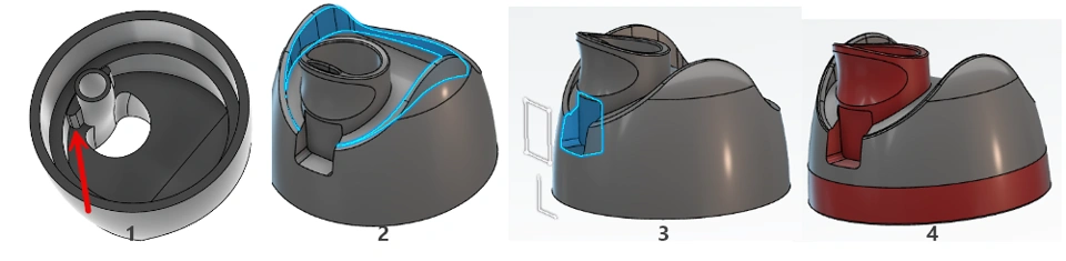 - I needed to fill in the area between the sip tube and inside walls of the cover. There is a small block of material in there indicated by the red arrow. I extruded a rectangular block upwards filling in the gap and using the Through Next end condition which merged nicely as intended.