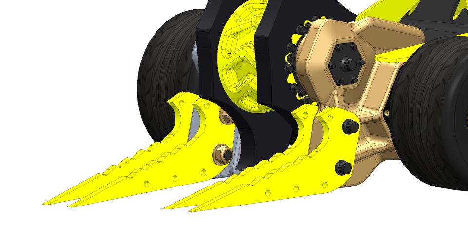 - At the last minute, we decided to give in to the prevailing strategy and designed a set of forks. We based them on the somewhat effective arms we had in season 3, but made them much beefier. The original had a 4 part lattice of 3/16” AR500, these new forks were just a single profile in half-inch AR500 held together in pairs with thick standoffs. We slotted the top mounting hole and were careful to not overtighten the bolt so they’d passively ground-scrape. Maybe it was laziness, but we just trusted the Billettes to be rigid enough to use as a plane reference, so we weren’t worried too much about how the forks would naturally settle along the floor.
