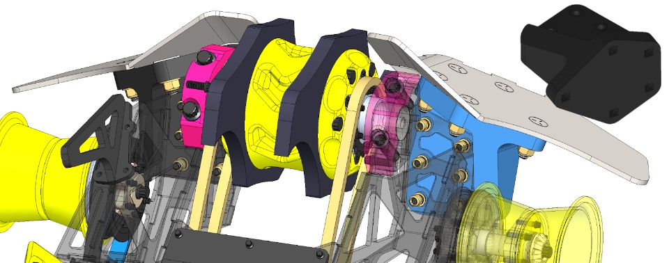 - We decided to take most of the features from the mega-billet and just integrate them into the chassis or at least their mounting. We separated the weapon motors from the rest of the chassis so they could be installed without having to feed anything through a slot or otherwise contort our hands inside the ever-shrinking chassis. We took the robust, box-like front corners from the S4 chassis and separated them from the weapon mount.