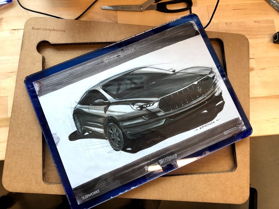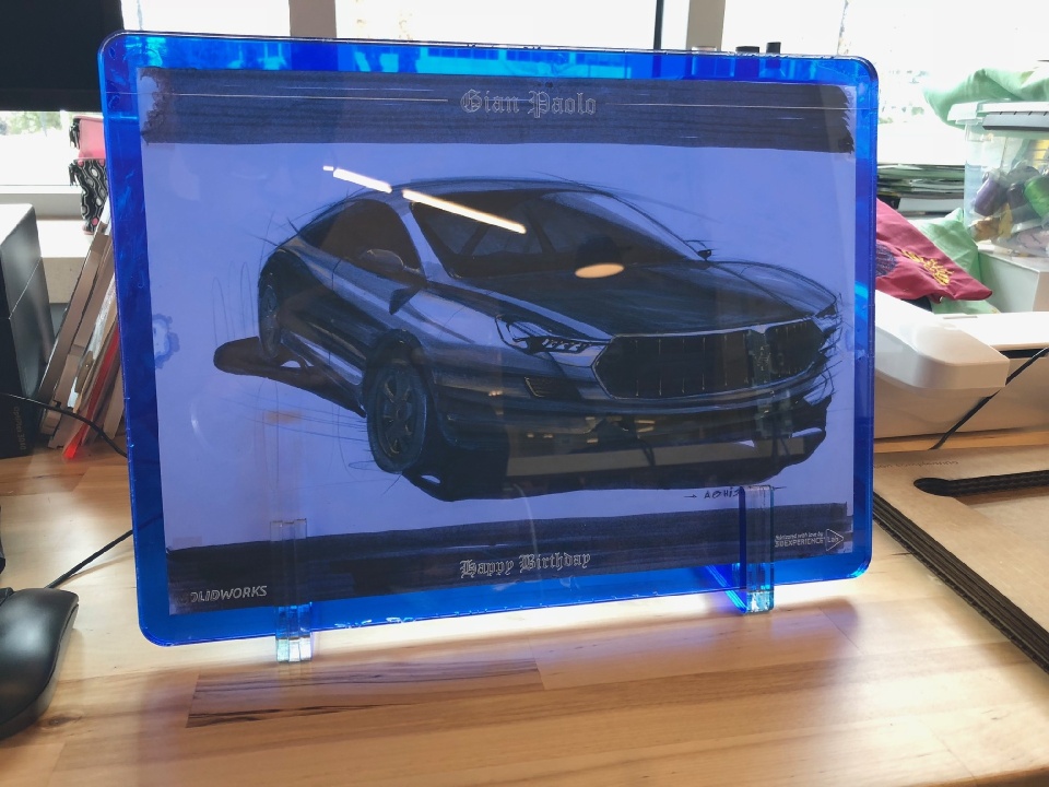For this one, I used Trotec Laser to cut two pieces of clear acrylic and sandwich the sketch between them. I could have done better in terms of finishing but it was my first time trying to avoid screws/clamps to hold two heavy pieces of acrylic (6mm thick) together.