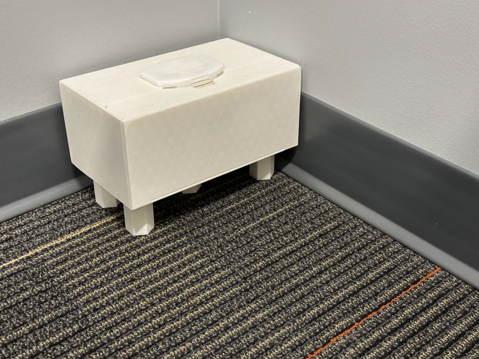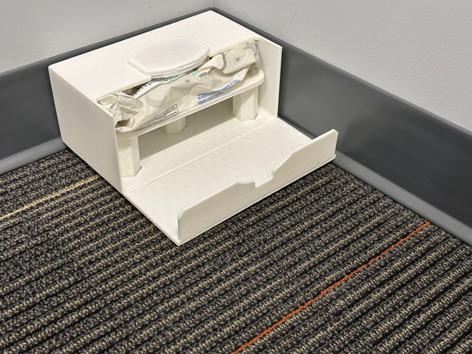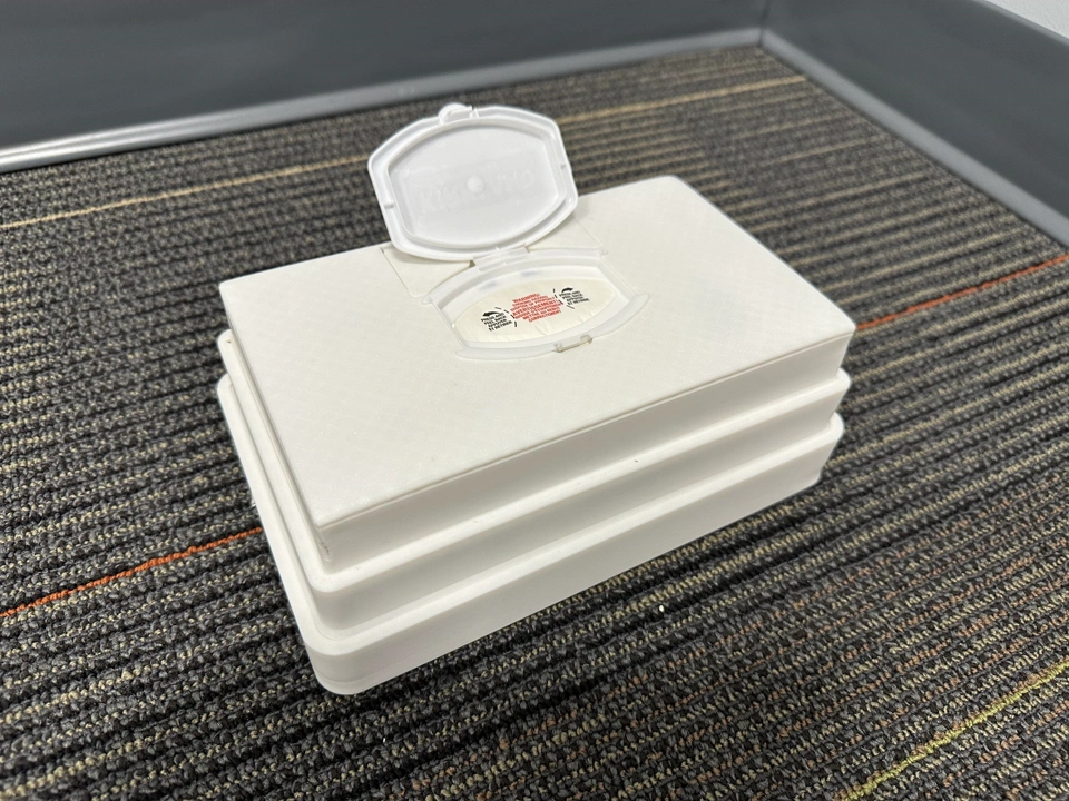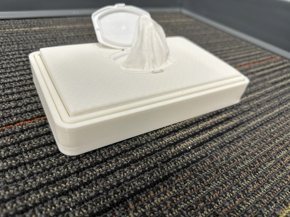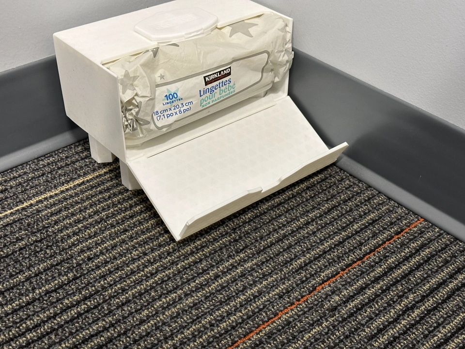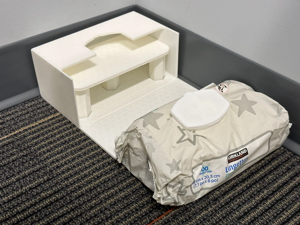 Trying to find a solution to the rustling noise of soft bagged baby wipes, I keep tinkering with the gravity holders and having to solve all kind of design problems.