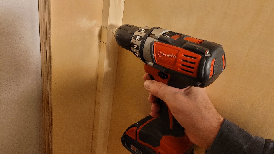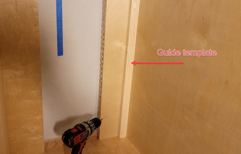 Here I positioned the guide to the right vertical interior edge of the cabinet. The width of the guide matches the distance between the holes and the right edge of the cabinet and the lines drawn on the side of the guide mark where the holes go.