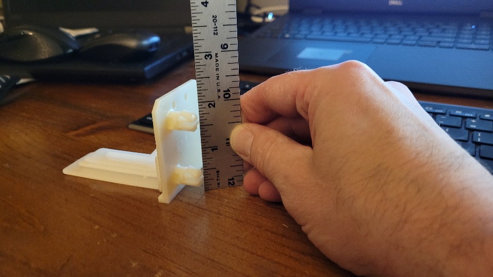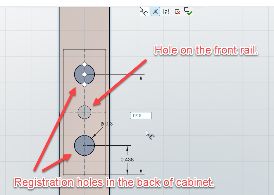 I created a new sketch on the narrow face of the support rail in xDesign. First, I drew a small circle to represent the first drill hole that I had already made as my datum which aligns with the bottom of the drawer as descried above. I then drew a rectangle with the dimensions for the plastic Front Hanger. I then determined when the glides are fully assembled, the bottom surface of the front and back hangers are coplanar. In the photo above of the back hanger, I measured each boss to be 7/16" (0.4375") and 1 11/16" (1.6875") from the bottom edge of the hanger.