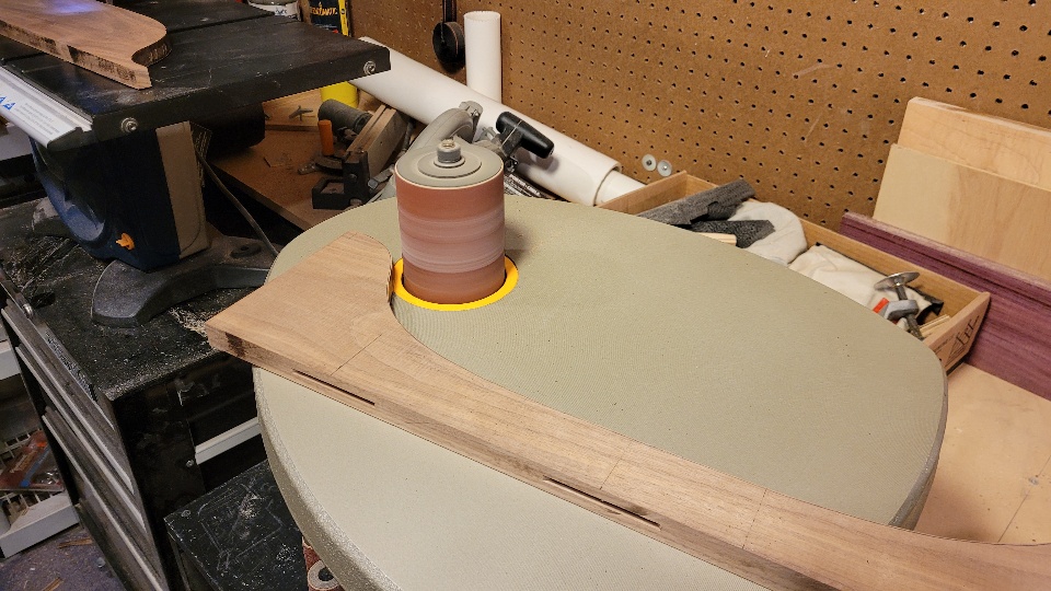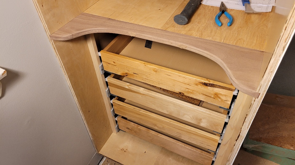 I had this idea to make a curved shelf divider out of walnut that would be a nice accent to each of the cabinets.