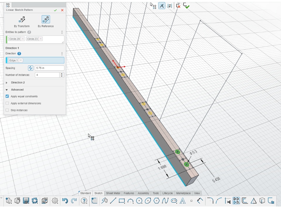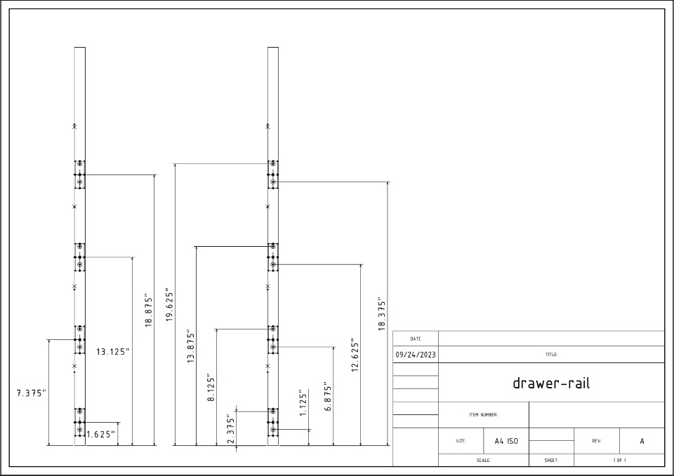 Next, I created another Sketch Pattern and spaced the back holes with the same 5.75" dimension. I switch apps over to xDrawing and dimensioned 2 views marking the dimensions from the bottom edge of the rail to each of the hole positions.