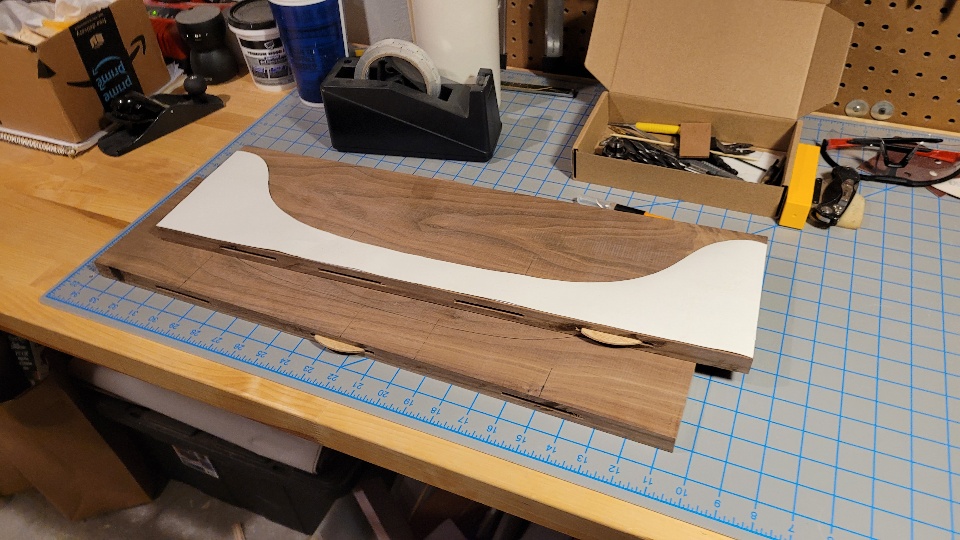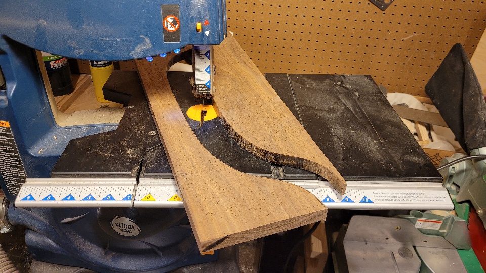 Here you can see the paper template sitting on top of the 2 walnut dividers, shown with the slots for biscuits. I traced a pencil line onto the walnut boards to use for cutting on the band saw. Note, it was easier to cut the biscuit slots before cutting the curve.