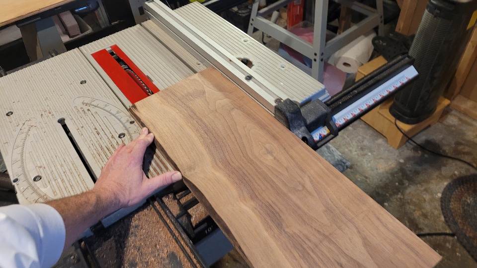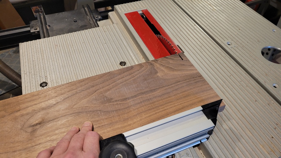 I started by cutting two rectangular pieces of walnut on my table saw that will slide into the void in front of the middle shelf. First by ripping the width of each piece.