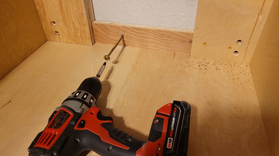Hear all of the holes are complete and the bottom 2 glides installed. Before I assembled all of the drawers I installed some 3 1/2" Cabinet Screws to securely attached the cabinet into the wall studs.
