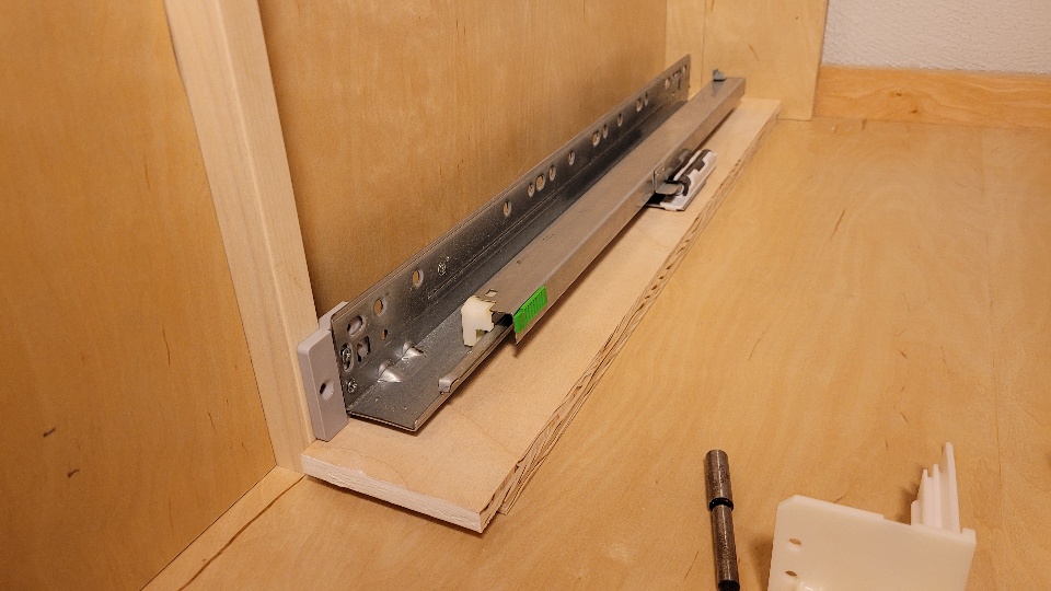 Each drawer glide has a plastic hanger that slides onto the back end of the glide and has 2 bosses that get inserted into 2 registration holes in the back of the cabinet support returns. I need to drill the holes precisely into the back of the cabinet and on the front rails to hold each drawer glide level, straight and evenly spaced.