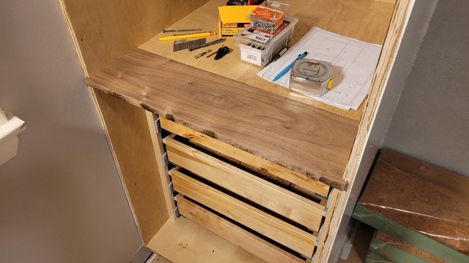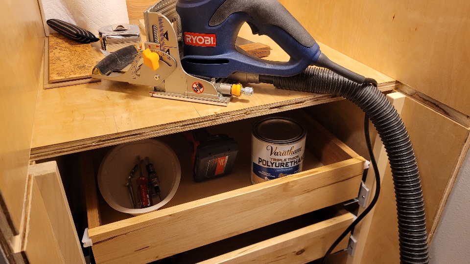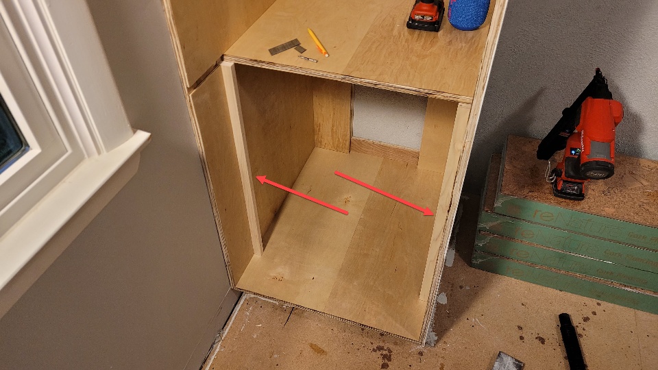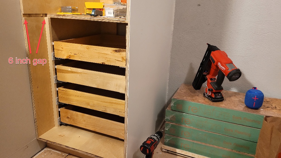 For most projects, this part of the job would be complete after installing the drawers, but my cabinets are 30" deep and the drawers are only 24" deep. This leaves a 6" space in front of the drawers where you can see the middle shelf does not extend completely to the front of the cabinet. This is because the shelf would cover 6 inches of usable space when the top drawer is in its open most position which I did not like for functional reasons.