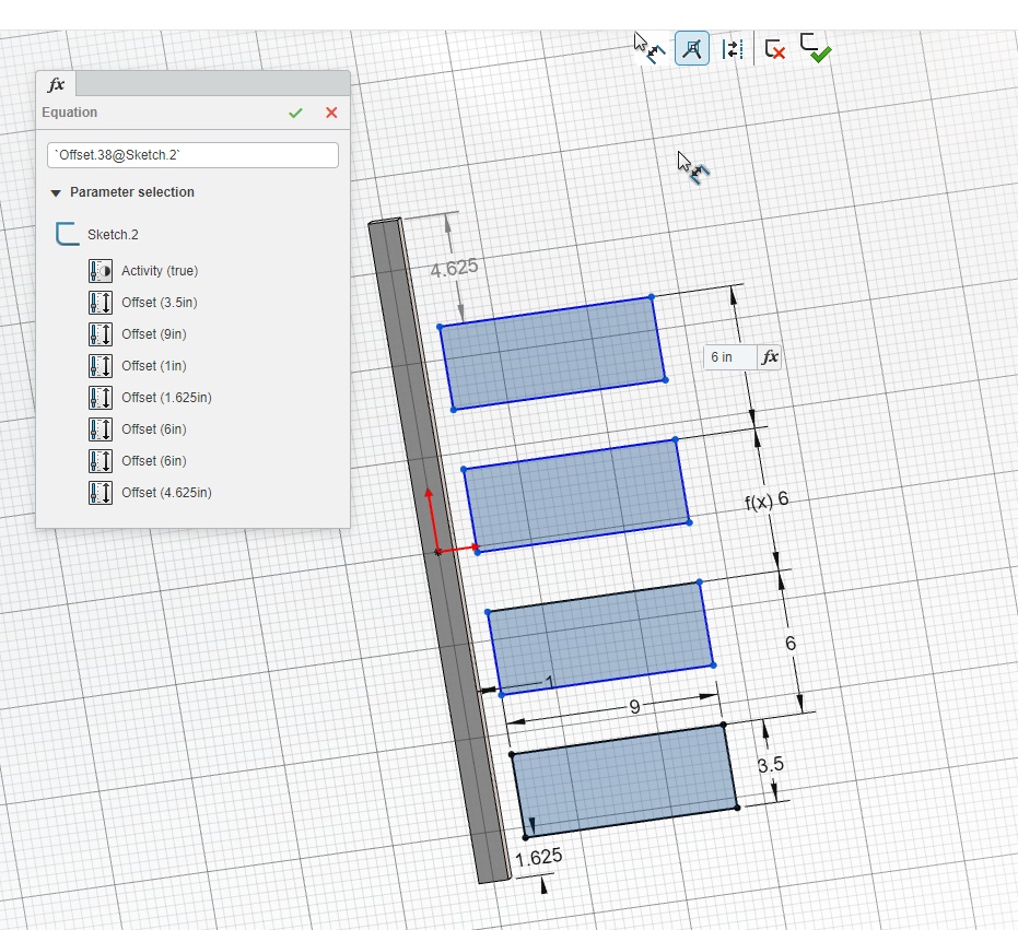 I then created a Sketch Pattern and entered a spacing dimension of 6" as a starting point. Once I completed the Sketch Pattern, I dimensioned the 2nd drawer to the fixed position of the bottom drawer. I dimensioned each of the other 2 drawers to their nearest sibling the same way. While still in Sketch, I created an Equation that made the 3rd drawer's spacing dimension equal to the 2nd drawer's spacing dimension. Then did the same for the 4th drawers spacing dimension equal to the 2nd drawer's spacing dimension. This way I can just change the one dimension and it will drive the spacing equally and I can adjust until I am happy with the spacing.