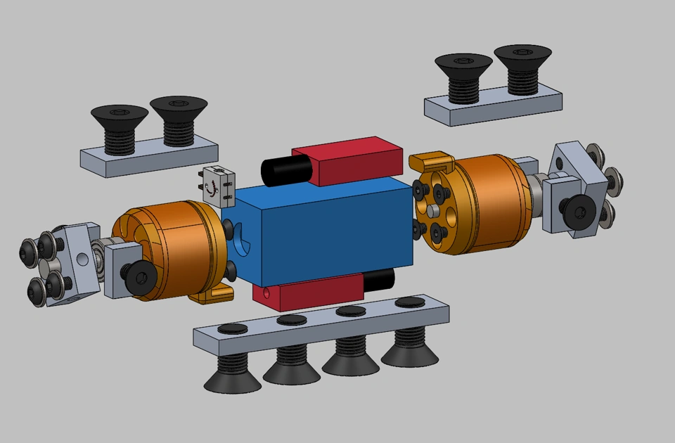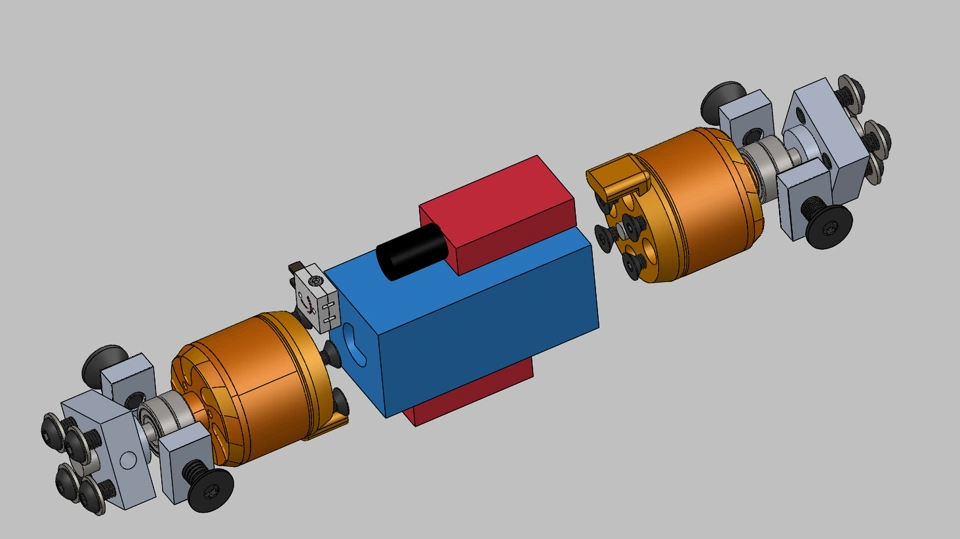 The first step of any good design is to take all the components you want to use and to smash them as close together as you dare! In this case, the motors are 3536 sized drone motors, the battery is a generic 4s 850mah, and the speed controllers are 70A AM32 ESCs from NeutronRC. The shafts are 5mm ejector pins, and the wheel hubs are hand made from some aluminum cutoffs. The only power tools needed to make this robot were a 3d printer and a drill press.