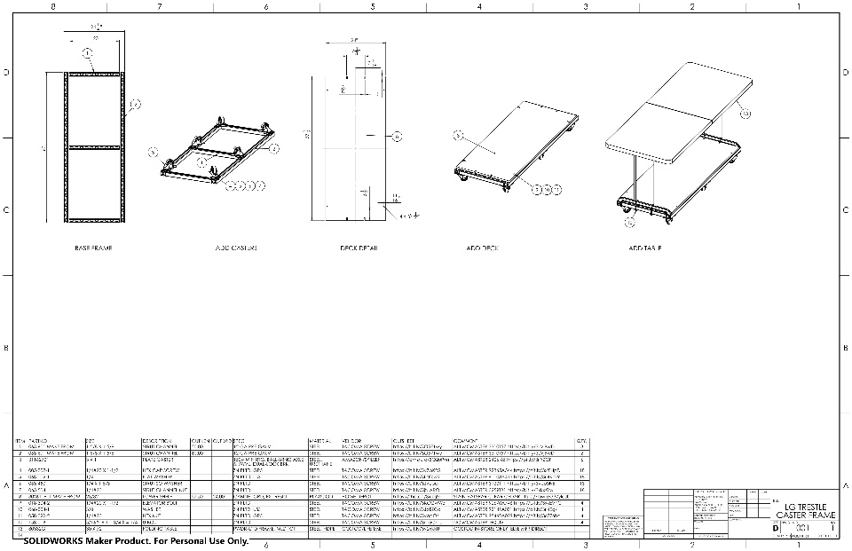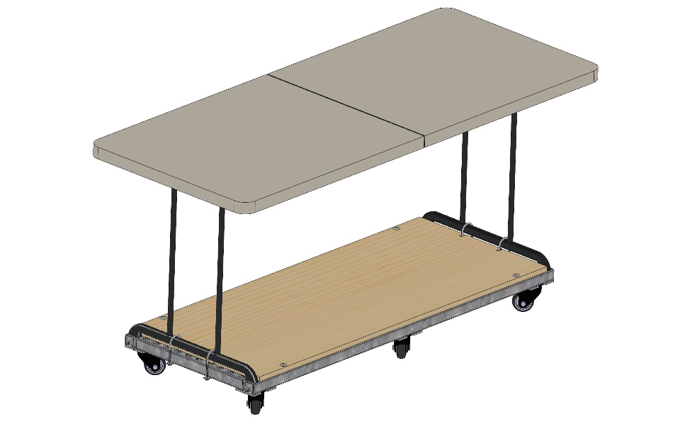 Tuning-up on SolidWorks configurations, online parts libraries, drawings and bills of material with a sturdy rolling worktable made from a commercial off-the-shelf folding table and custom six-wheeled channel strut frame. Estimated load capacity 900 pounds, evenly-distributed. Liked it so much I built two of them.