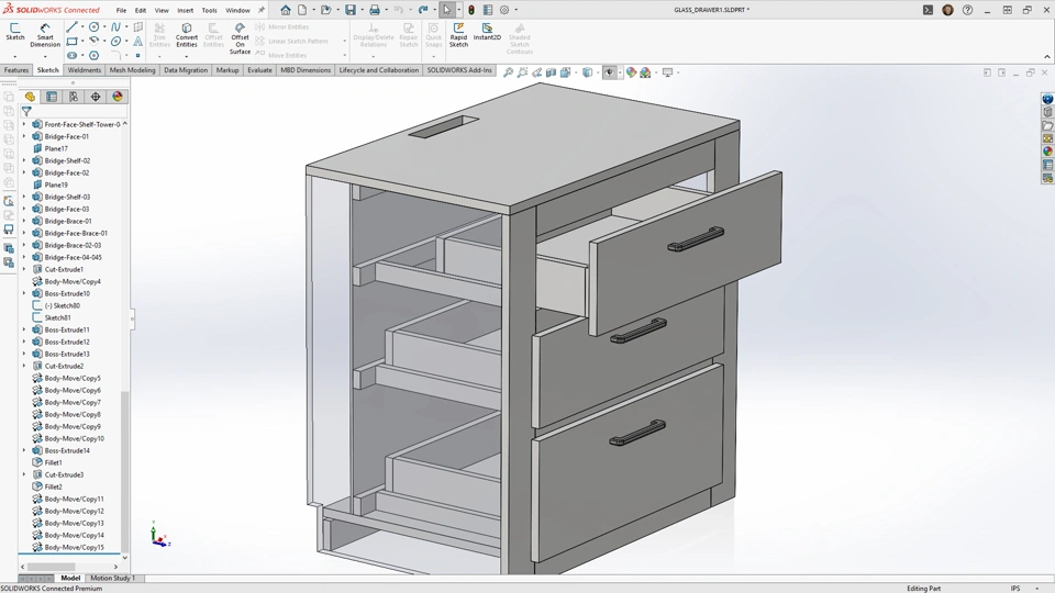 Since I'm familiar with SOLIDWORKS, I used it to design the shelf system that will go over Maxton’s bed. This design was straightforward—I wanted plenty of shelves and storage for all his stuff. Making furniture is new to me, especially creating drawers, but I think I can figure them out. They’re just boxes with slide rails, right? How hard could it be?