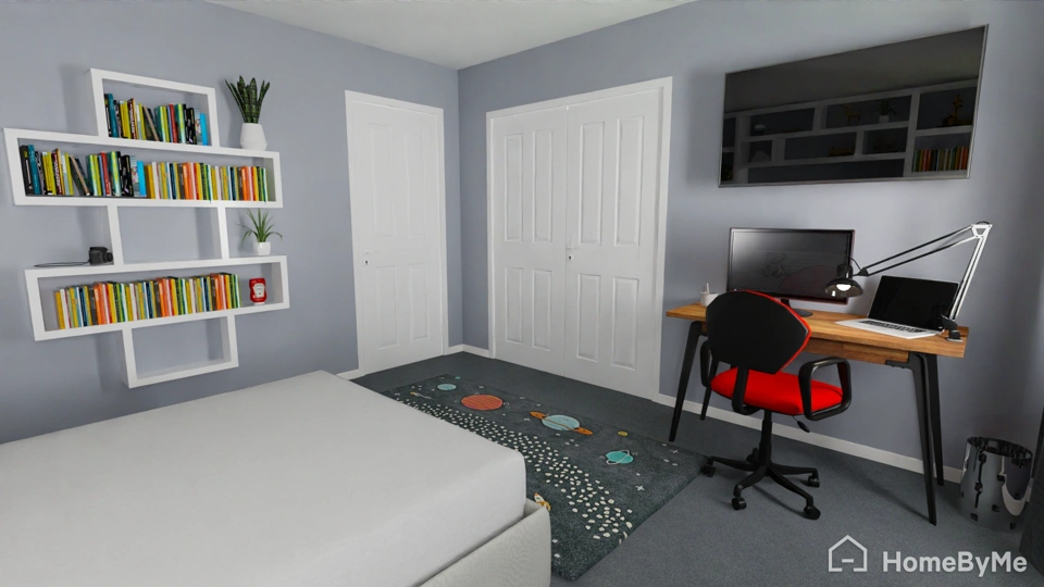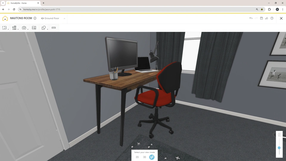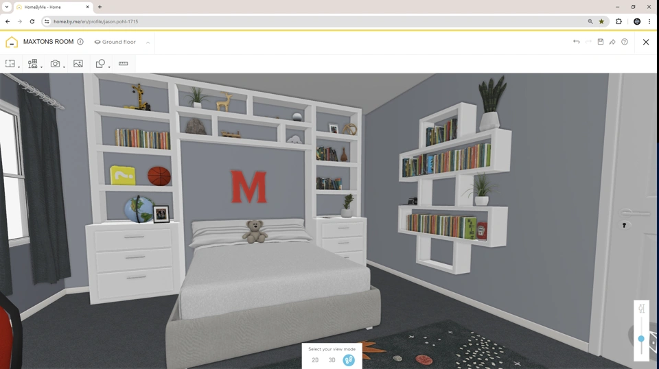 After this was completed I started modeling up the shelves, I then uploaded all the parts into my Home By Me scene. From there, I added more detail, importing my own parts and filling the room with Maxton’s stuff. I added toys and found some books to fill up those custom shelves.