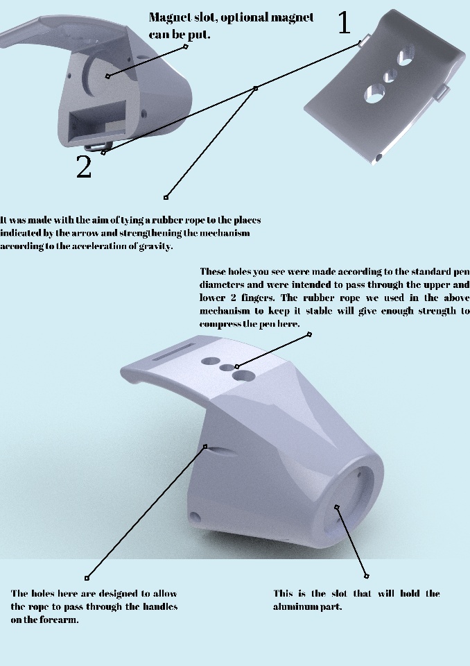 Since I don't have a fastening device, I showed it when tying it with fishing line, it is tied to the shoulder in this way, and the Velcro straps coming out from 4 sides are fixed with a wide band that wraps around them, as I did last time, thus offering both an aesthetic appearance and a comfortable usage experience. In addition, with the mechanism to be attached to the neck on the back of the forearm, it collects all the load on the spine and this provides a user experience without making us feel any weight. At the same time, since it is a smart design, if you wear this connection on your wrist, this process will be connected to the elbow and this time your biceps will take the load. I could have made bendable designs, but the reason why I can't do it is because the corners will stretch and break in long-term use. That's why I provided such a design and such a grip experience.