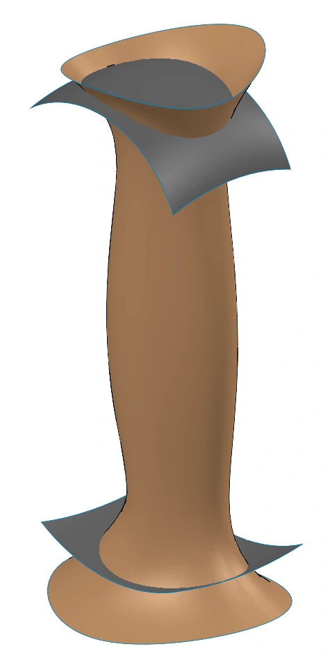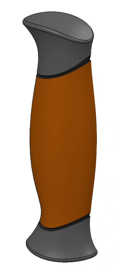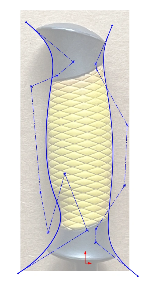 The first handle I designed was based off the original, where I inserted a picture as a reference and then sketched a series of splines to use in a closed loft. I revolved oversized patches for the top and bottom surfaces and then hit them with the remarkable 'Intersect' command which trimmed them into a solid in one fell swoop! A few small fillets and a hole to accept the umbrella post is all I needed to finish the design (though I embellished it a bit with two swept cuts).