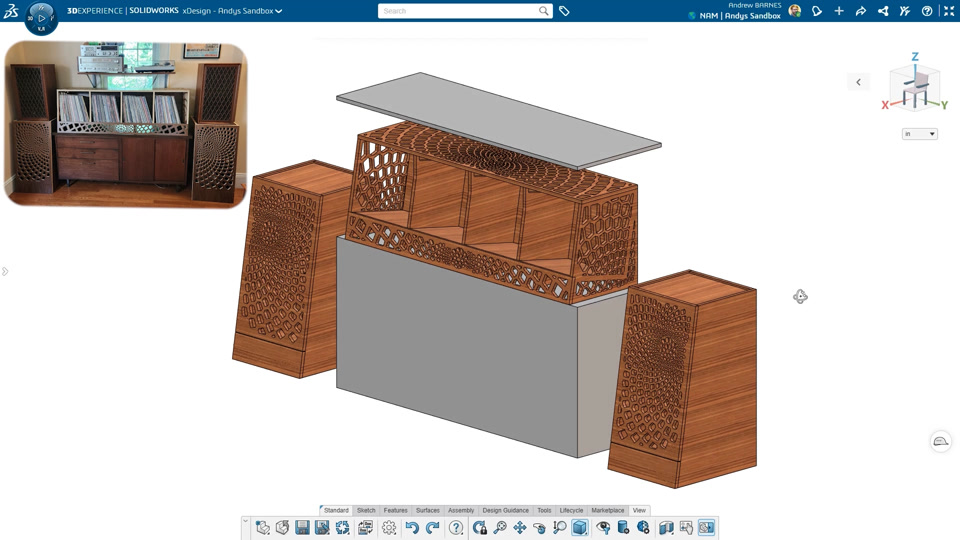 Andy started his project in xDesign with a layout sketch to capture all of the critical dimensions. From there he modeled the various pieces of a long cabinet and two tall speaker stand cabinets.