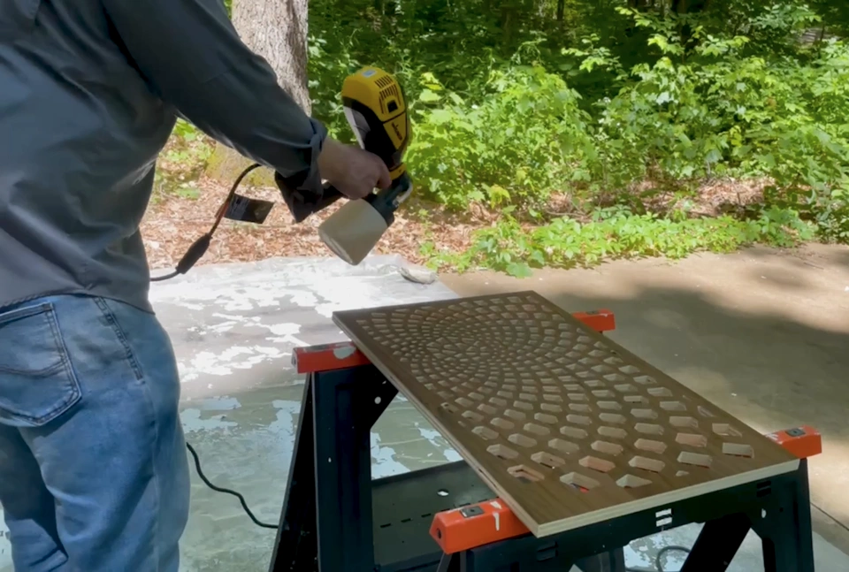 Applying finish to the pieces was fun. The only practical way to do so was with a paint sprayer. It allowed us to get into all of the nooks and crannies of the design. We sprayed 4 coats of a hybrid water and oil polyurethane finish. On a warm, dry day, the coats dried in less than 20 minutes, so we could sand and reapply very quickly.