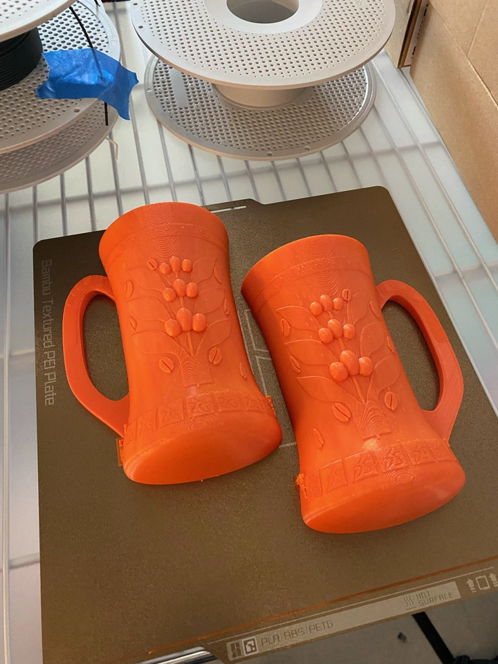 Our colleagues in the Product Management team put out a challenge to design your creative mug with our cloud apps and some selected designs would get 3D printed. So we purchased some food-safe filament from Bambu Labs and I helped to prepare them for printing. Here are some of the pieces that were printed. What a creative bunch!