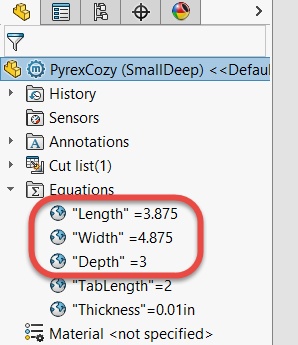 Once everything was sewn together, we tested the fit and then jumped back into SOLIDWORKS to add a bit more flair to the model. We added a few global variables to make it really easy to modify the Length, Width, and Depth of the shape and then built four configurations that match the sizes of Pyrex that we have at our house.