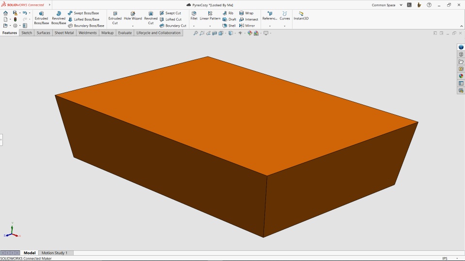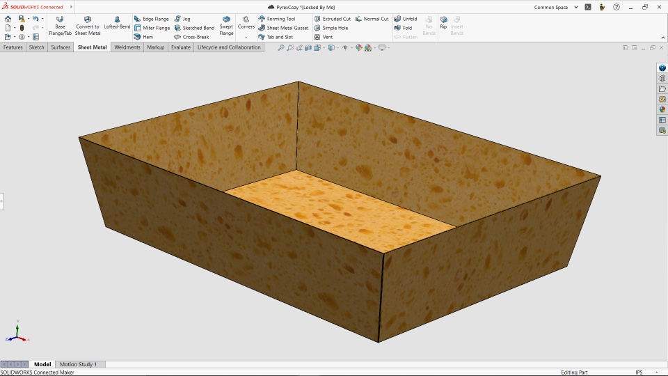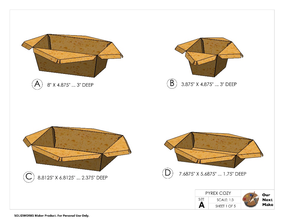 When we bring leftovers to work for lunch, we usually pack them in one of our Pyrex containers. These variously sized rectangular vessels don't fit nicely into the bowl-shaped cozy, so we hopped into SOLIDWORKS to work out a design that would fit perfectly.