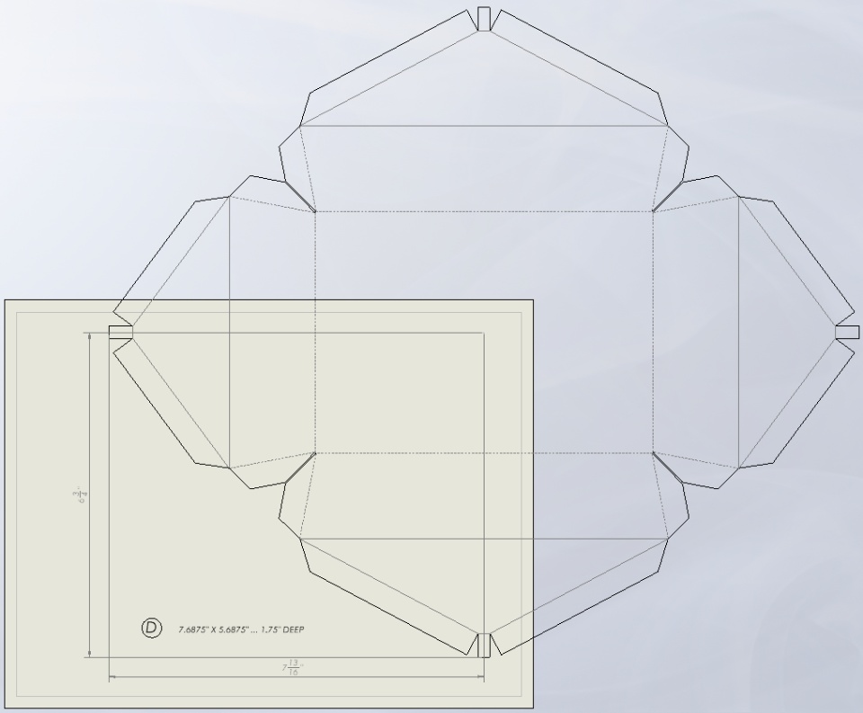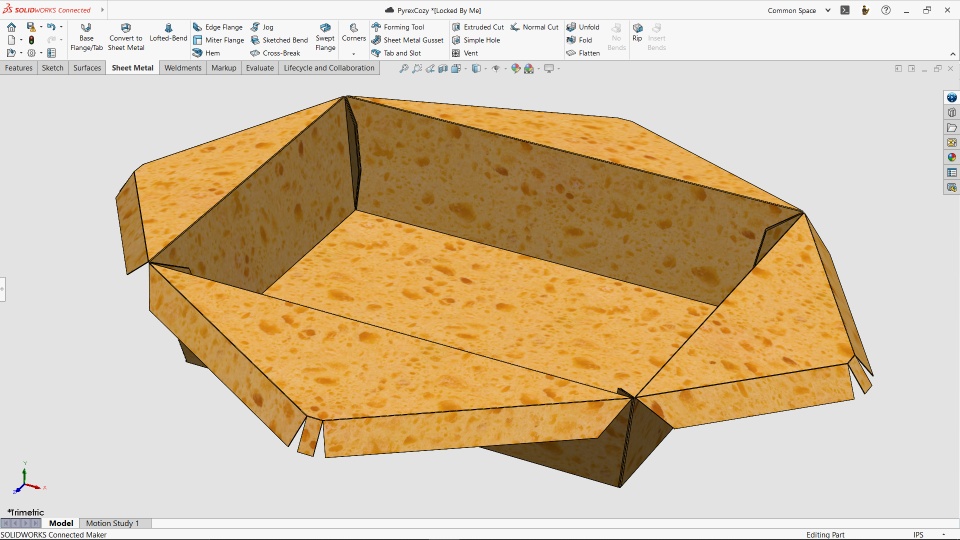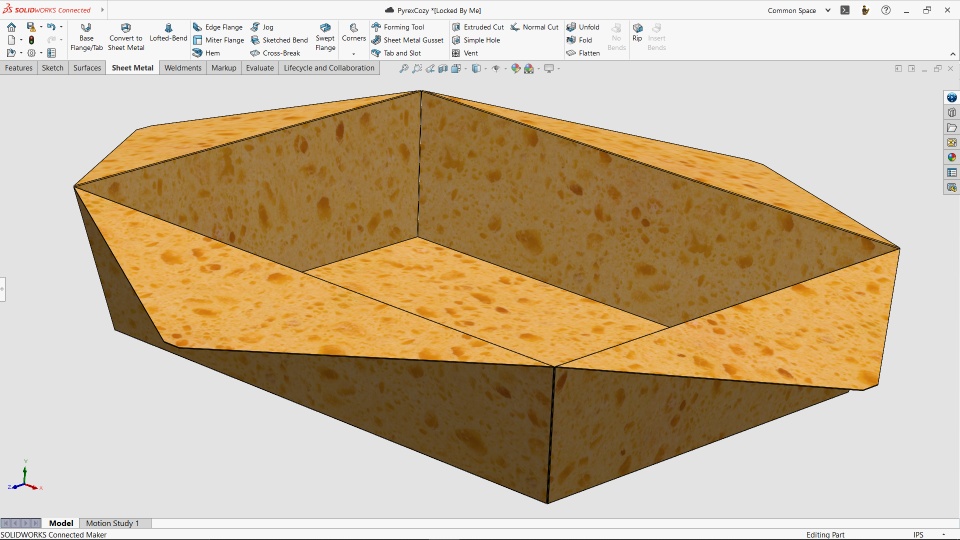 We started with a basic shape that matched the size of our most commonly used Pyrex container. Then we used the "convert to sheet metal" command to instantly transform it into the bottom and side pieces of fabric!