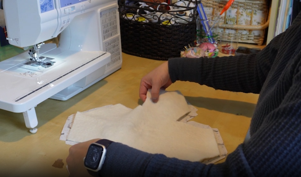 Then we started the process of sewing everything together! First we attached a layer of batting that will act as the insulating barrier between the container and your hands.