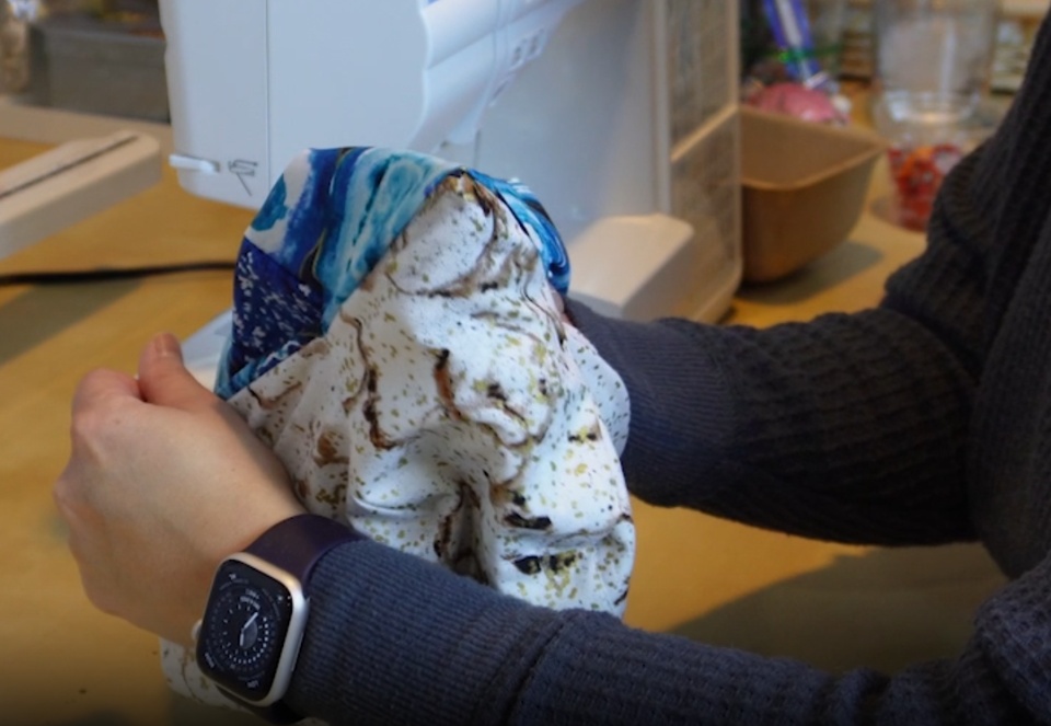 Then we sewed on the second layer of fabric. We used a completely different piece of fabric to add visual interest and drive home the idea that the cozy is reversible.
