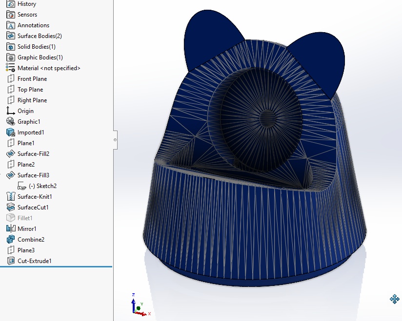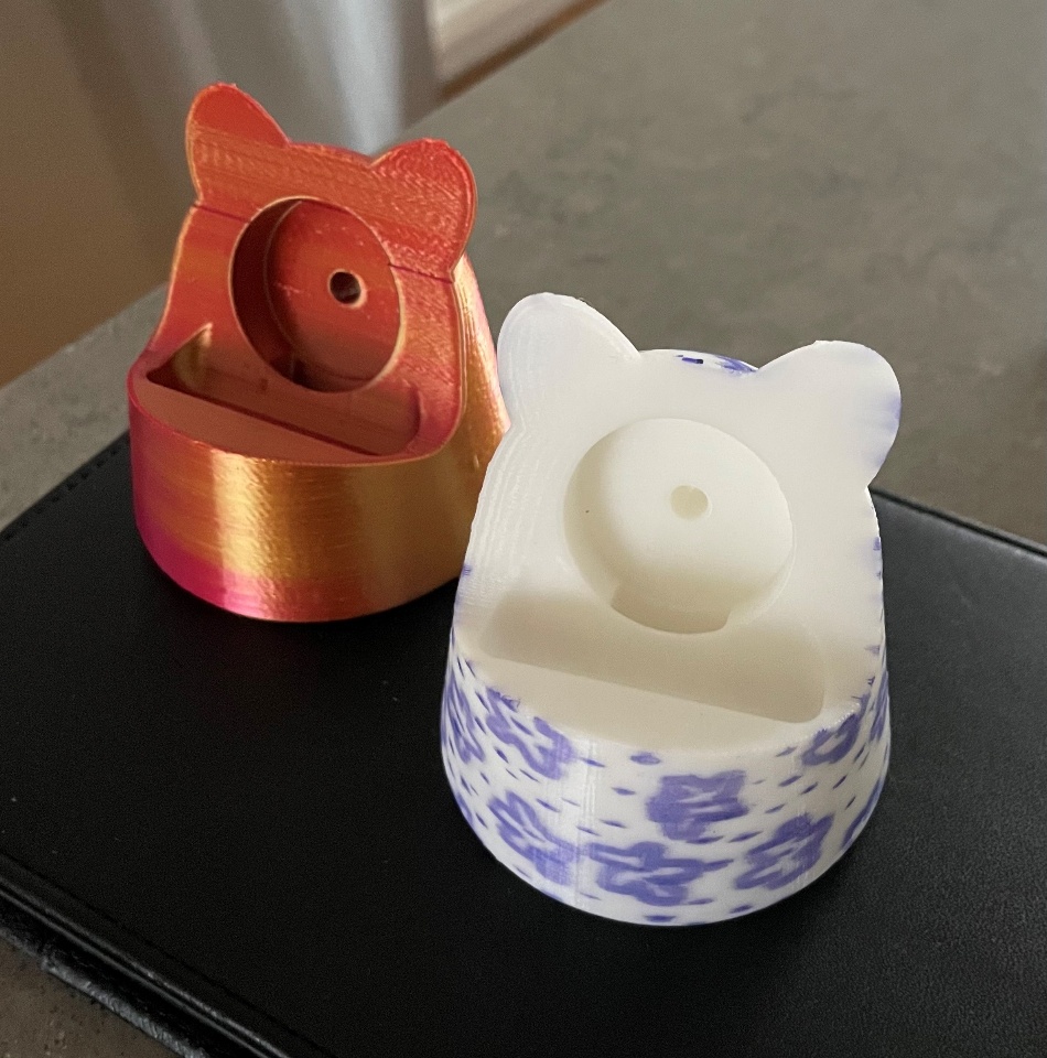 I started with a STL and brought it into SOLIDWORKS for Makers and got creative. The newish mesh modelling mode made it easy to add some cat ears and it was off to the printers. The one on the right was printed on a Sindoh with my daughters decorating touches, and the left one on a Prusa.