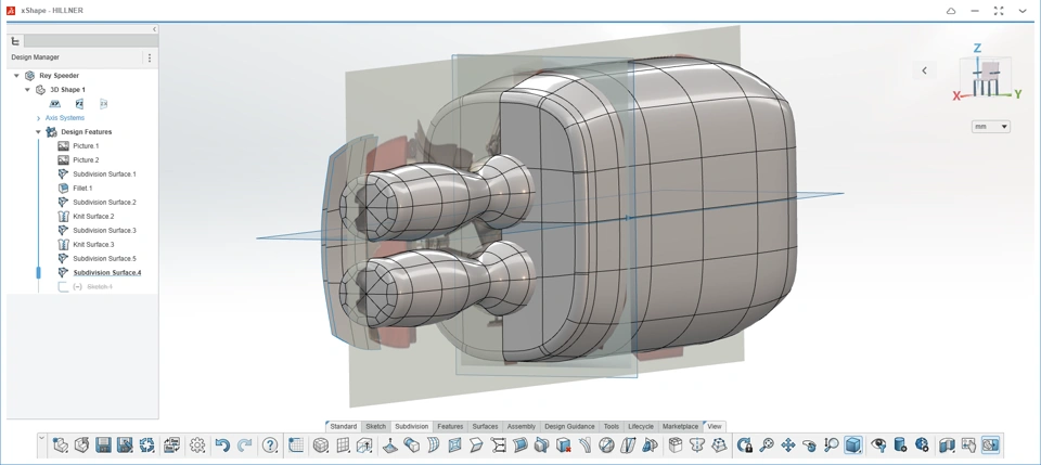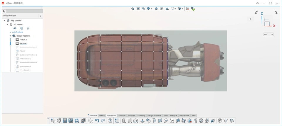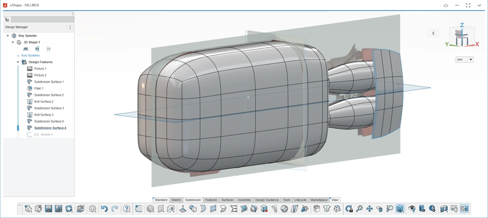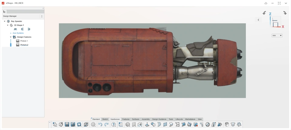 I've always wanted to use 3D Sculptor (xShape) and 3D Creator (xDesign) to model Rey's Speeder from the Star Wars reboot The Force Awakens. I'm starting to block in the main shapes using 3D Sculptor, and then I'll add more of the parametric details using 3D Creator.
