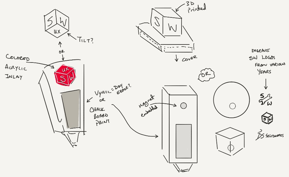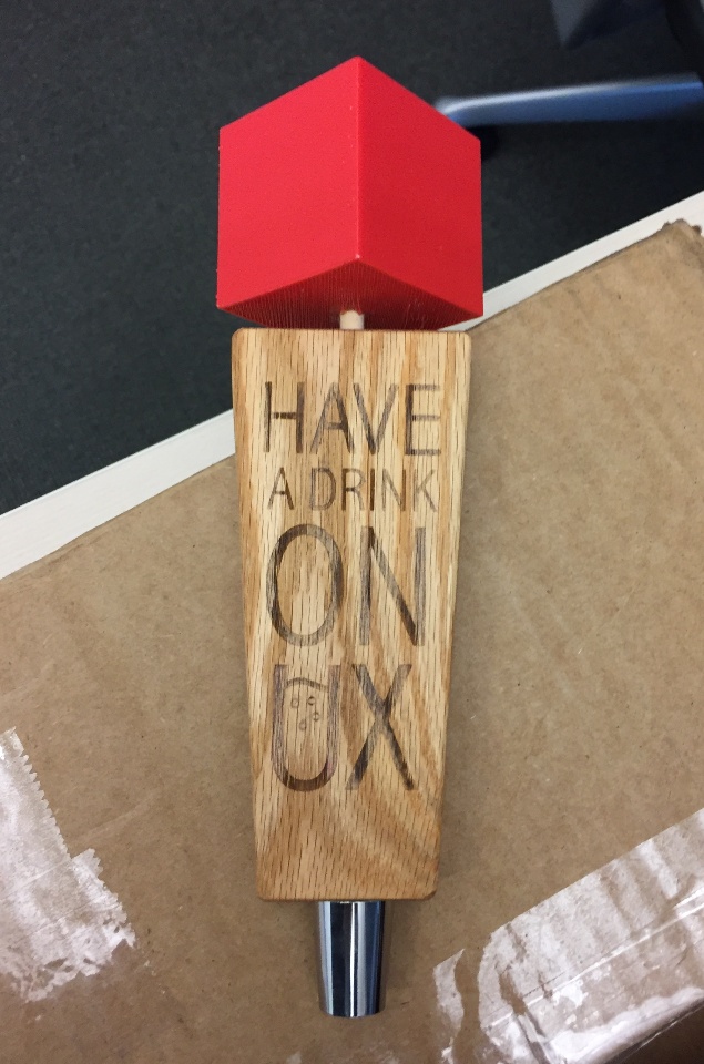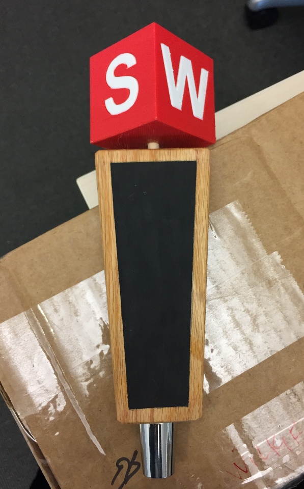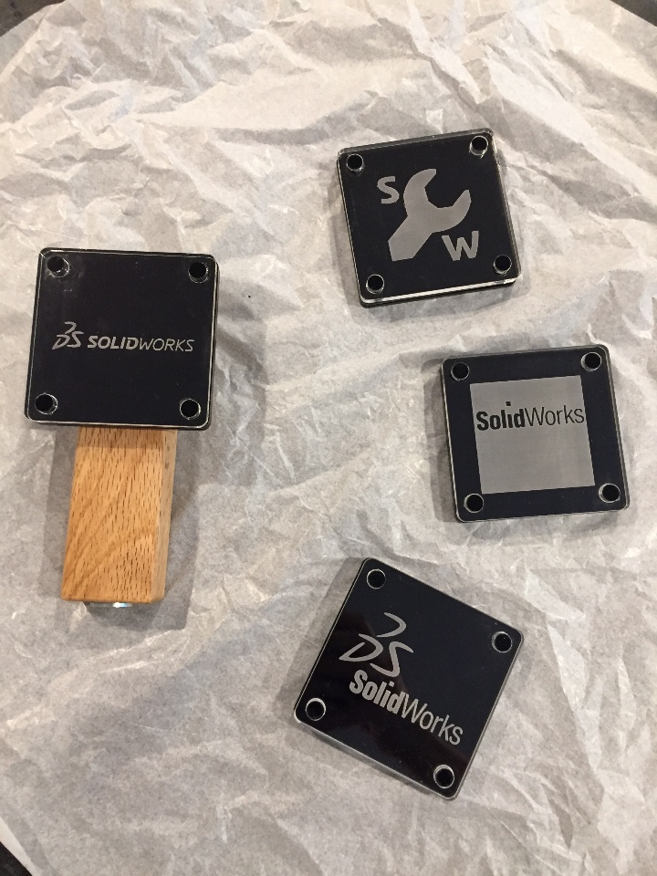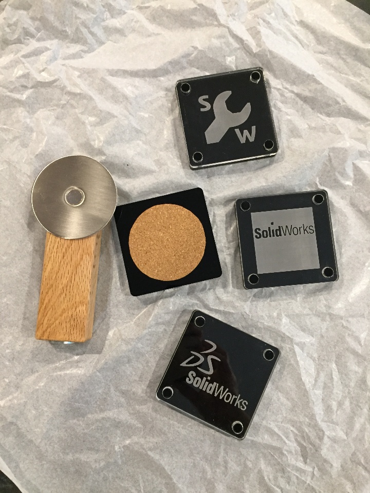Handle 2: with magnetic coasters with old SolidWorks logos that can stick to the handle or placed down for drinks.