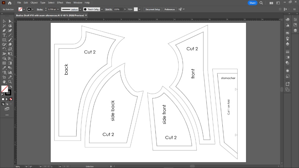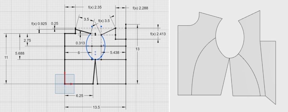 And so using that sketch, I was able to extrude it just a little bit. I added my seam allowances, so I just didn't like offset by a half inch around the entire thing. And then I threw it into a drawing file in 1:1 scale and then exported that as an Adobe Illustrator file, so that I could send it to my printer as a title to print. I just had like the normal paper printer at home not like a big one that normally patterns are printed on.