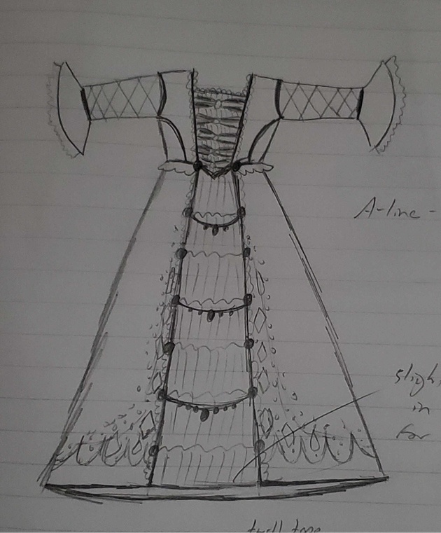 Because this was totally custom. I didn't have any patterns I was working with. I was asking her - I pulled up collections of features of a dress and had her pick which one she liked the best. I specifically remember, I had a diagram with 30 different types of sleeves. And I said, "Which one do you like the best? What shape skirt do you like the best?" And she picked all of them. And I drew up a couple of different designs until settling on the one that she liked the best.