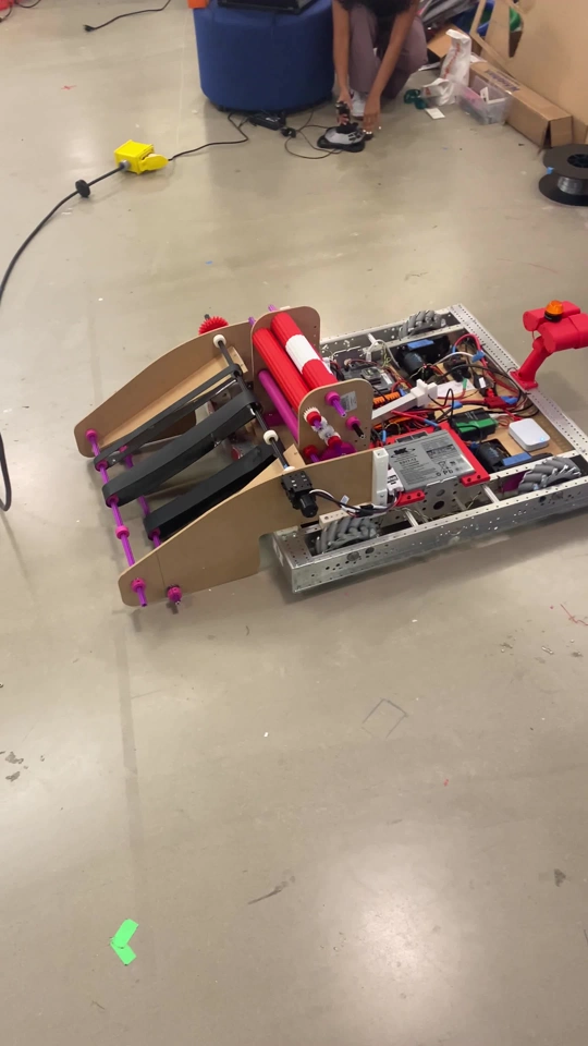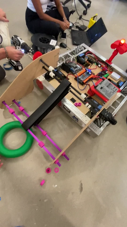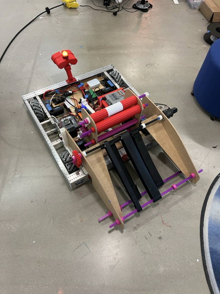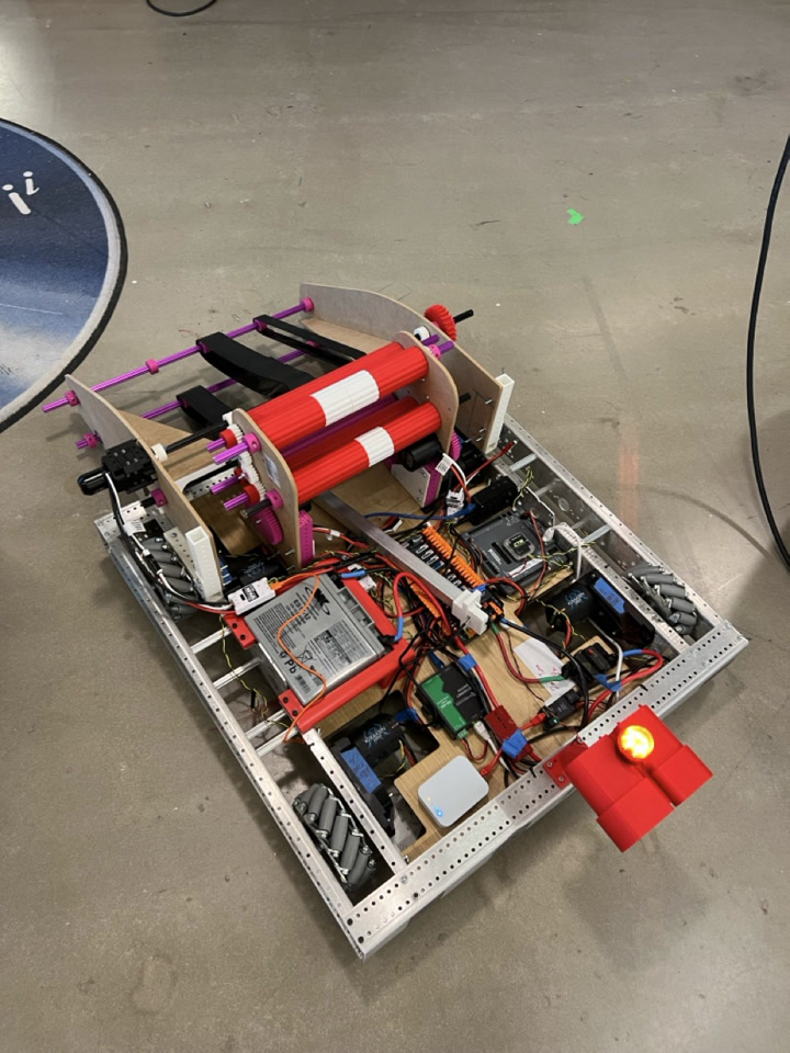After manufacturing all of the parts using the 3DEXPERIENCE Lab machinery. We assembled the full robot and this is how it came out. All the plastic colorful parts were 3D printed using Bambu Labs P1S FDM printer. The E-board was made up of laser cut plywood and the upstructure walls were made on the CNC Router out of MDF.