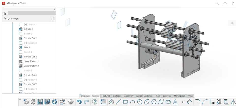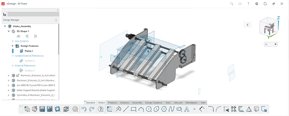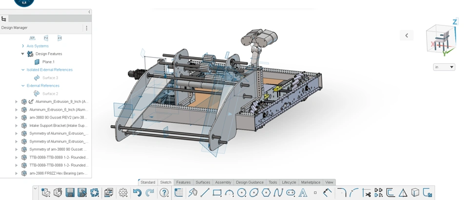 This challenge started on a chassis from AndyMark which we were able import into xDesign as a STEP file and then start designing on top of that geometry.