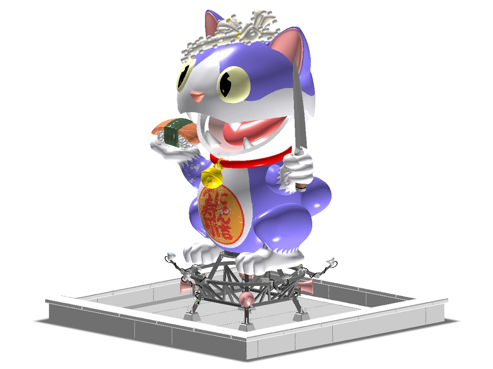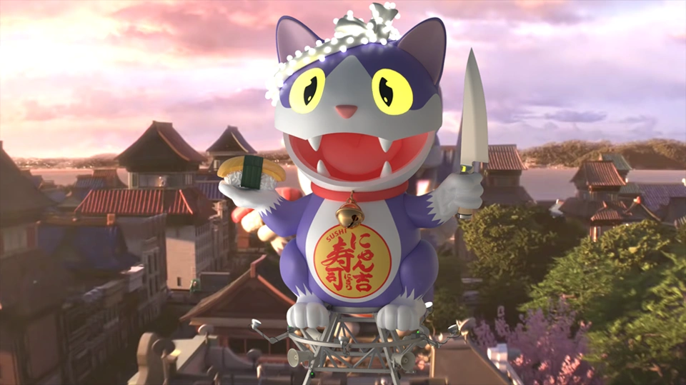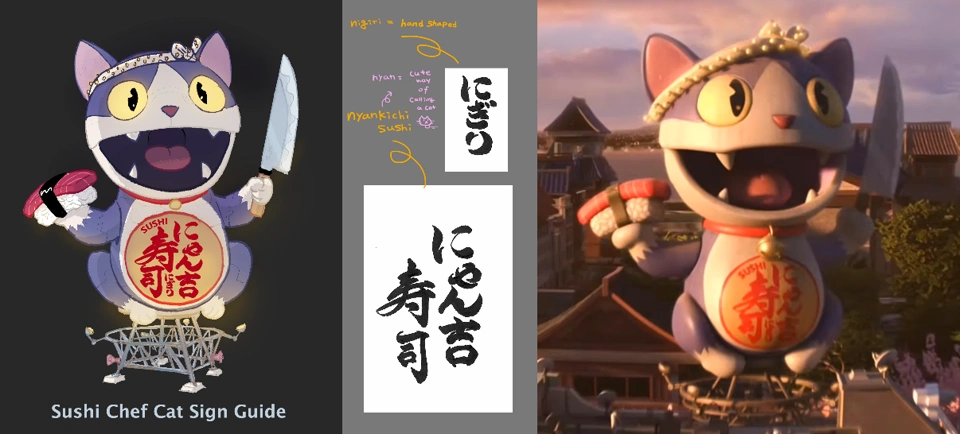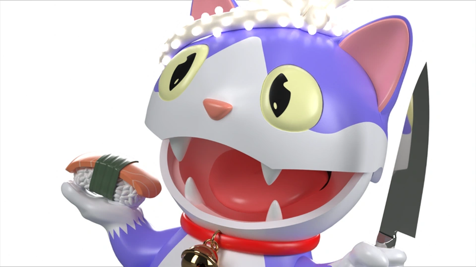 I have a small lucky cat figure I got when I visited Japan and thought this would be a good way of testing out my Sub-D modeling skills. The model was quite simple, so I kept searching for something similar and then while watching Big Hero 6 I caught a glimpse of "Sushi Chef Cat" and ended up tracking down some of the concept art for it.