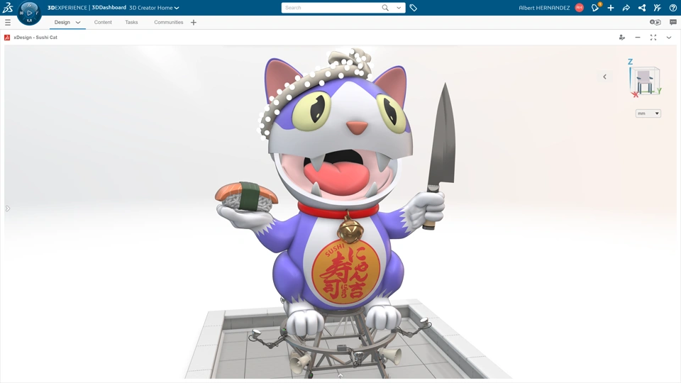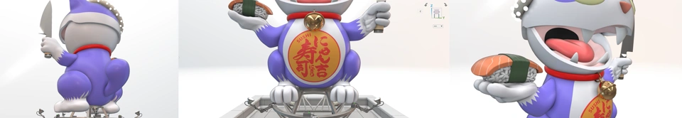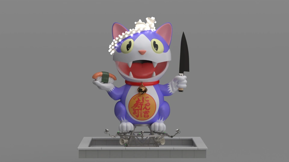 I broke the cat down into its respective body parts and started modeling the head. Getting the proportions/positions right were very important as that affected the other parts of the model. Once the cat was complete, I was able to focus on the accessories (nigiri, headband, and knife). The cat then needed a place to sit atop so I modeled a metal frame to hold it up with and included speakers, lighting, and wires. Lastly, I quickly mocked up a roof to showcase the design.