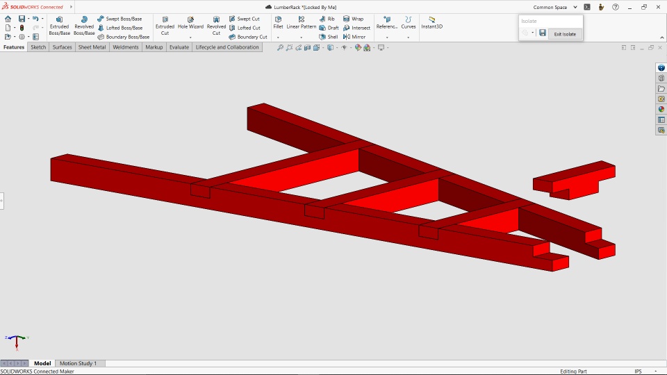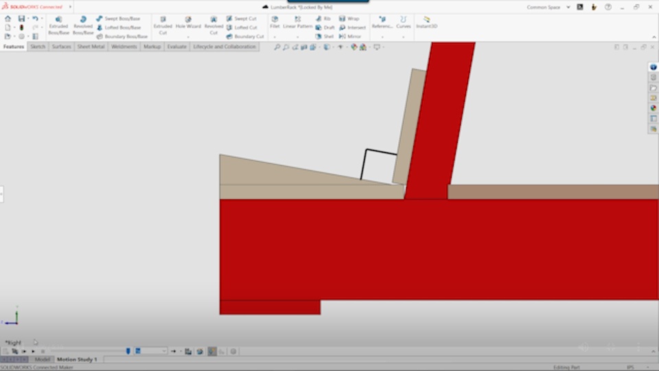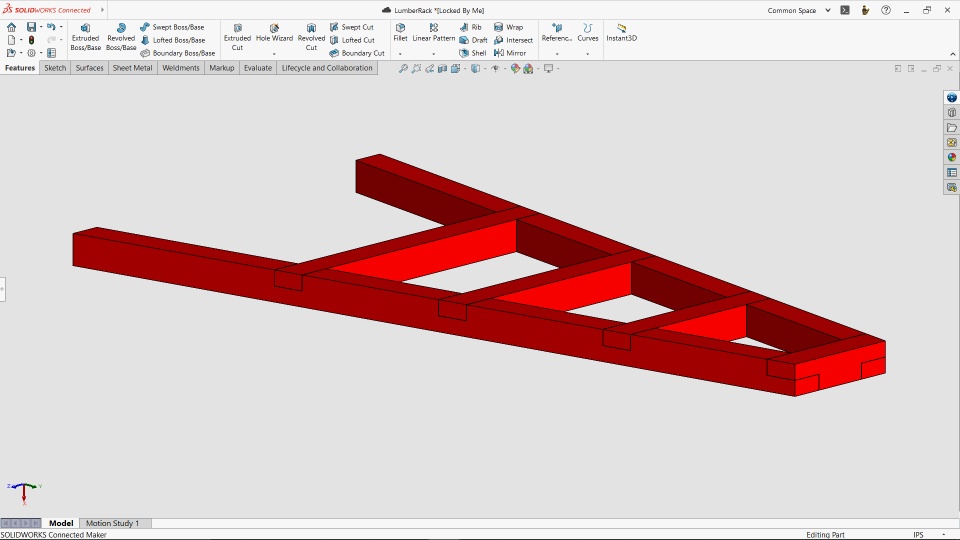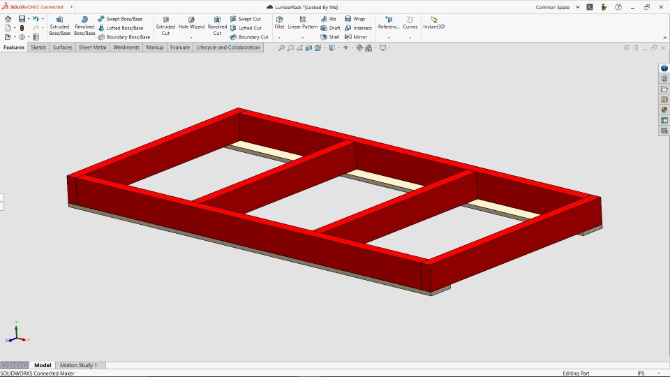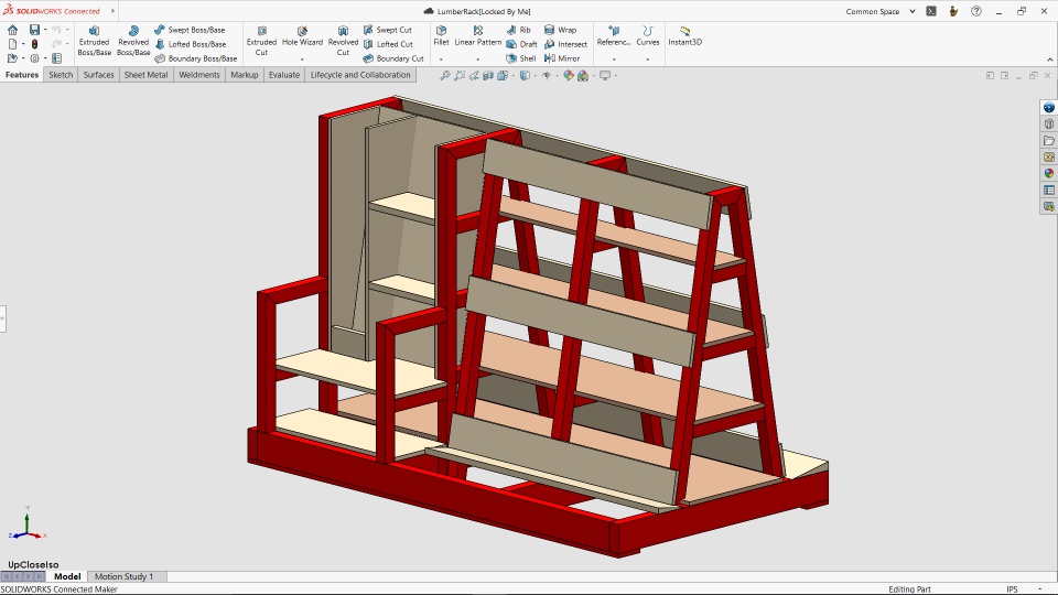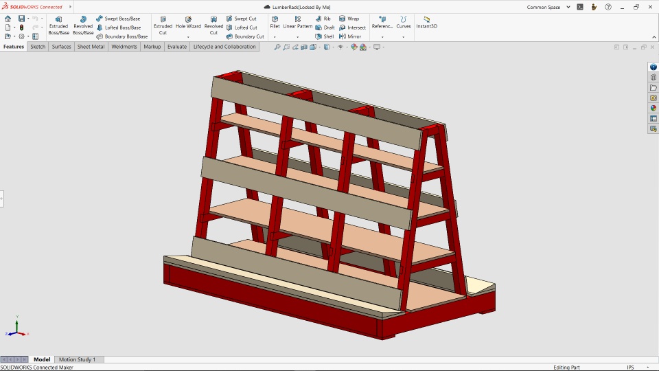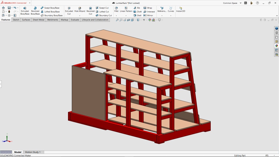 As always, we fired up our SOLIDWORKS for Makers license and got to designing. At first, we imagined a cart that could do it all, with one side for plywood, long and short shelves for lumber, and a bin for storing short pieces vertically.